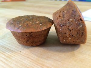- マフィン型の八分目まで生地を流して約15分焼く。表面に焼き色がつくまでです。このレシピは膨らまないマフィンなので注意してください。