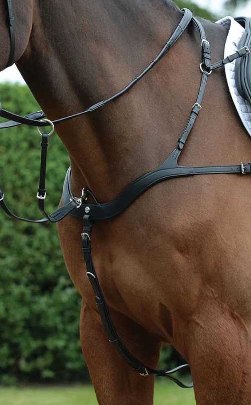 馬の動きを妨げず、擦れを最小限に抑えるニューデザインの幅広胸部分パッドの5点式胸ガイ
