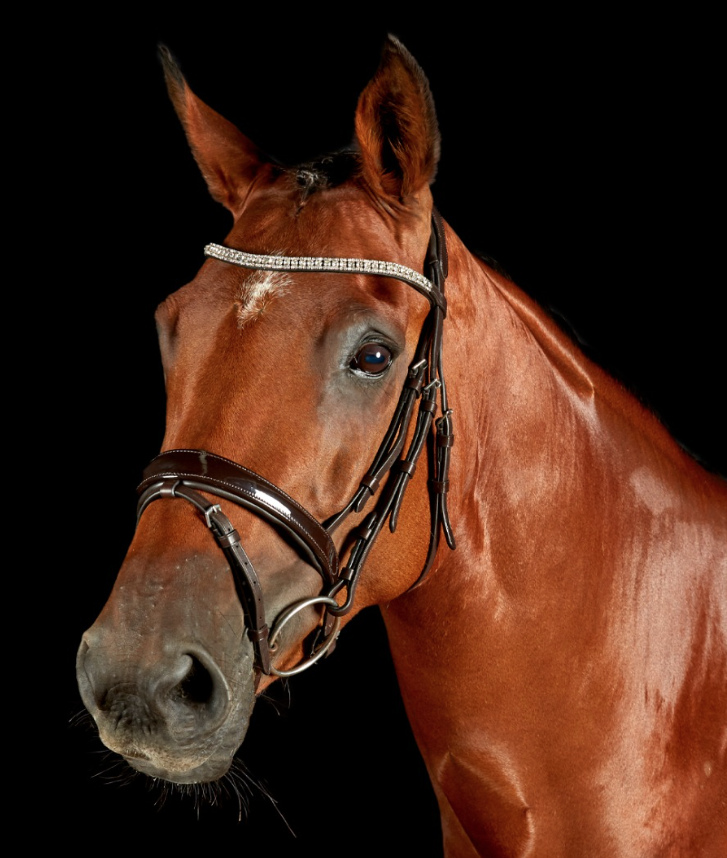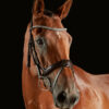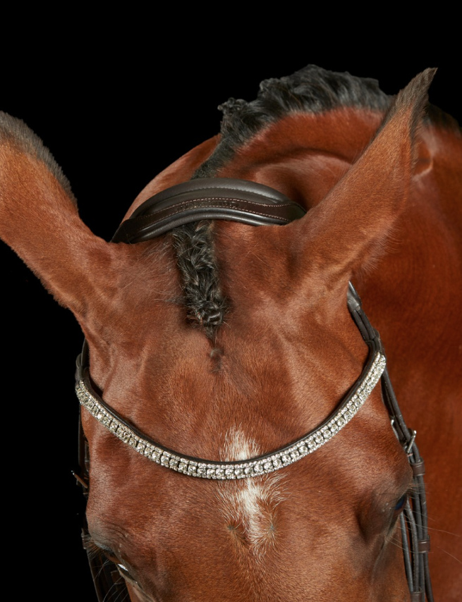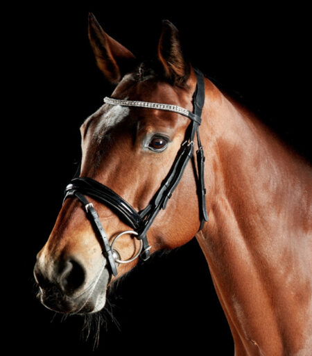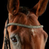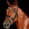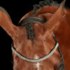 落ち着いたクリスタル入り額革とエナメル仕上げの鼻革がおしゃれな頭絡