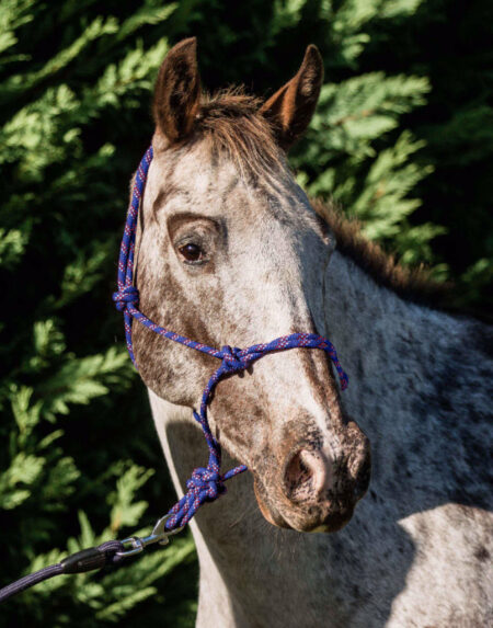ナチュラルホースマンシップにも使われる馬の顔を傷つけないカラフルで可愛い模様入りロープタイプの無口